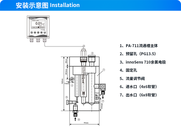 流通槽應(yīng)靠近innoCon 6800CL控制器安裝,將PA-711用螺栓固定在掛板上,然后將掛板安裝在支架上或垂直的墻面上。依照流通槽示意圖將進(jìn)出水軟管與接頭連接好,排水管必須垂直向下且無背壓排放。