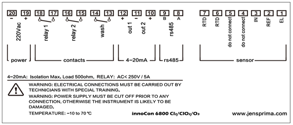 控制器的連接端子位于儀器內(nèi)部,打開蓋板,進(jìn)行電源、電極和信號輸出的接線。